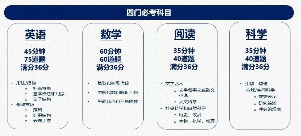ACT的考試題目主要測試學生高中階段的基礎知識和學術能力,與高中課程的關聯程度較高,同時也測試學生思考和判斷的能力。 ACT包含了英語、數學、閱讀、科學,寫作是選考。其中科學推理整合了高中的物理、化學、生物等學科,以推理題目的形式出現。雖然寫作是選考,有一些名校會要求學生提供寫作成績。四個科目的測驗題目不同,測試時間也各有長短。