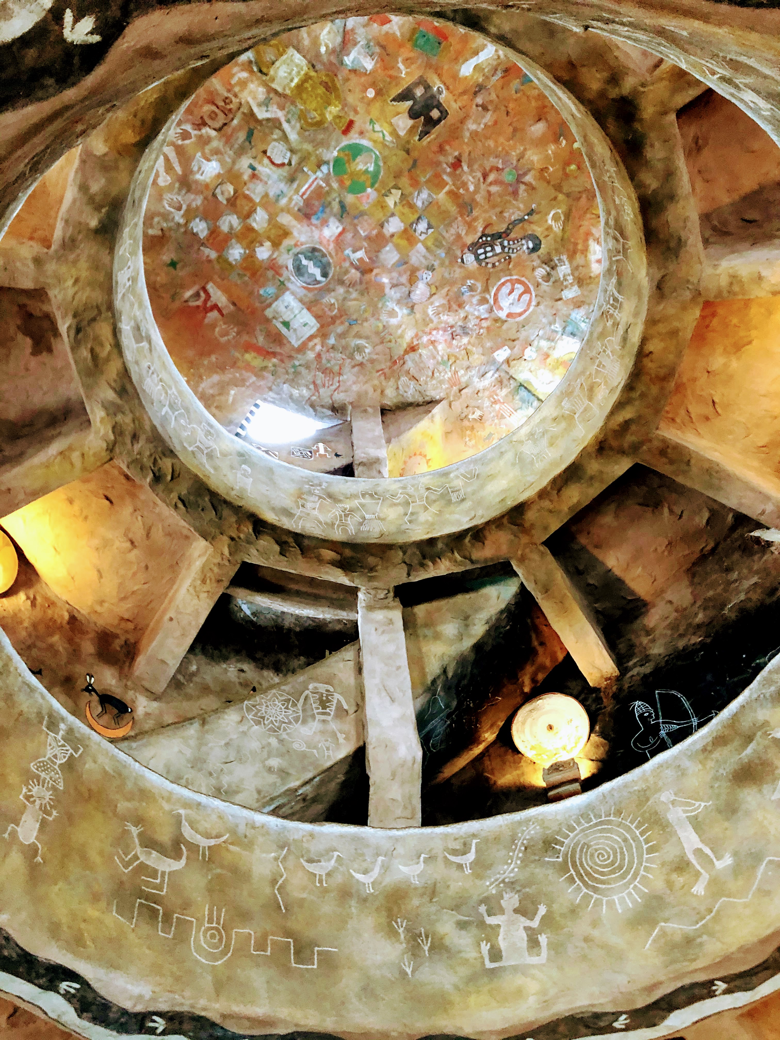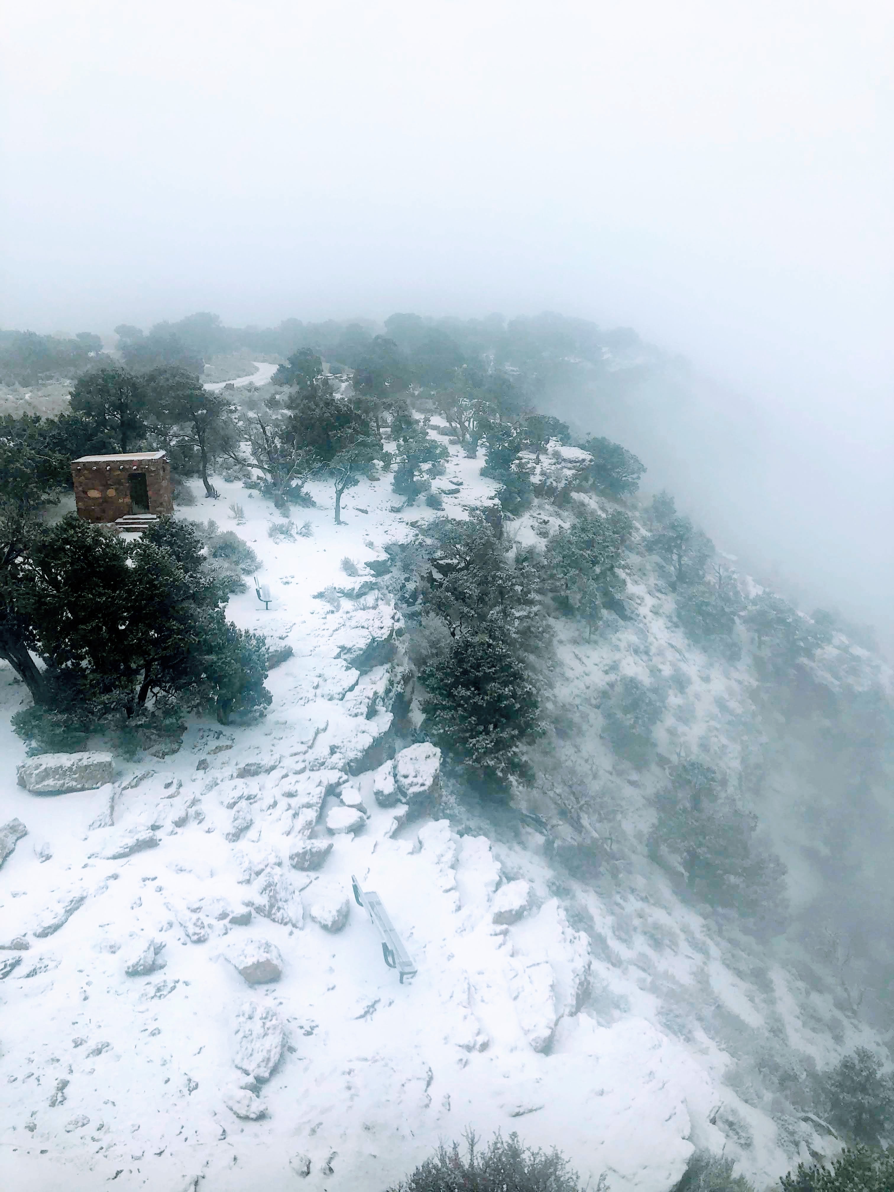 公園裡提供四條免費接駁車線路,但沒有覆蓋到的 Desert View Drive。這裡往東很長的一段路上,還零星分佈著一些景點,這些地方只能自己駕車前往。第三天我們離開大峽谷往東,正好要去這個方向。這天忽然開始下雪,我們踏著雪進入瞭望塔,看不清太多風景,於是逛了塔内的陳設,觀賞早期印第安人的文物,人文與自然風景並存,歷史的滄桑中帶著一種質樸陳舊的美感。即使冬天飄著雪,也是步步美景,令人驚嘆。